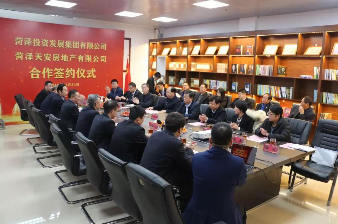 2019年12月30日下午,菏澤投資發(fā)展集團(tuán)有限公司與山東天安房地產(chǎn)有限公司在天安房地產(chǎn)公司黨建會(huì)議室就萬(wàn)達(dá)廣場(chǎng)合作項(xiàng)目簽署合作框架協(xié)議。菏投集團(tuán)黨委書(shū)記、董事長(zhǎng)徐文芹,菏投集團(tuán)黨委副書(shū)記、董事、總經(jīng)理丁萬(wàn)國(guó),山東天安建信集團(tuán)董事長(zhǎng)兼總經(jīng)理劉紹海,山東天安建信集團(tuán)執(zhí)行總經(jīng)理劉軍,各銀行機(jī)構(gòu)負(fù)責(zé)人等出席本次簽約儀式。