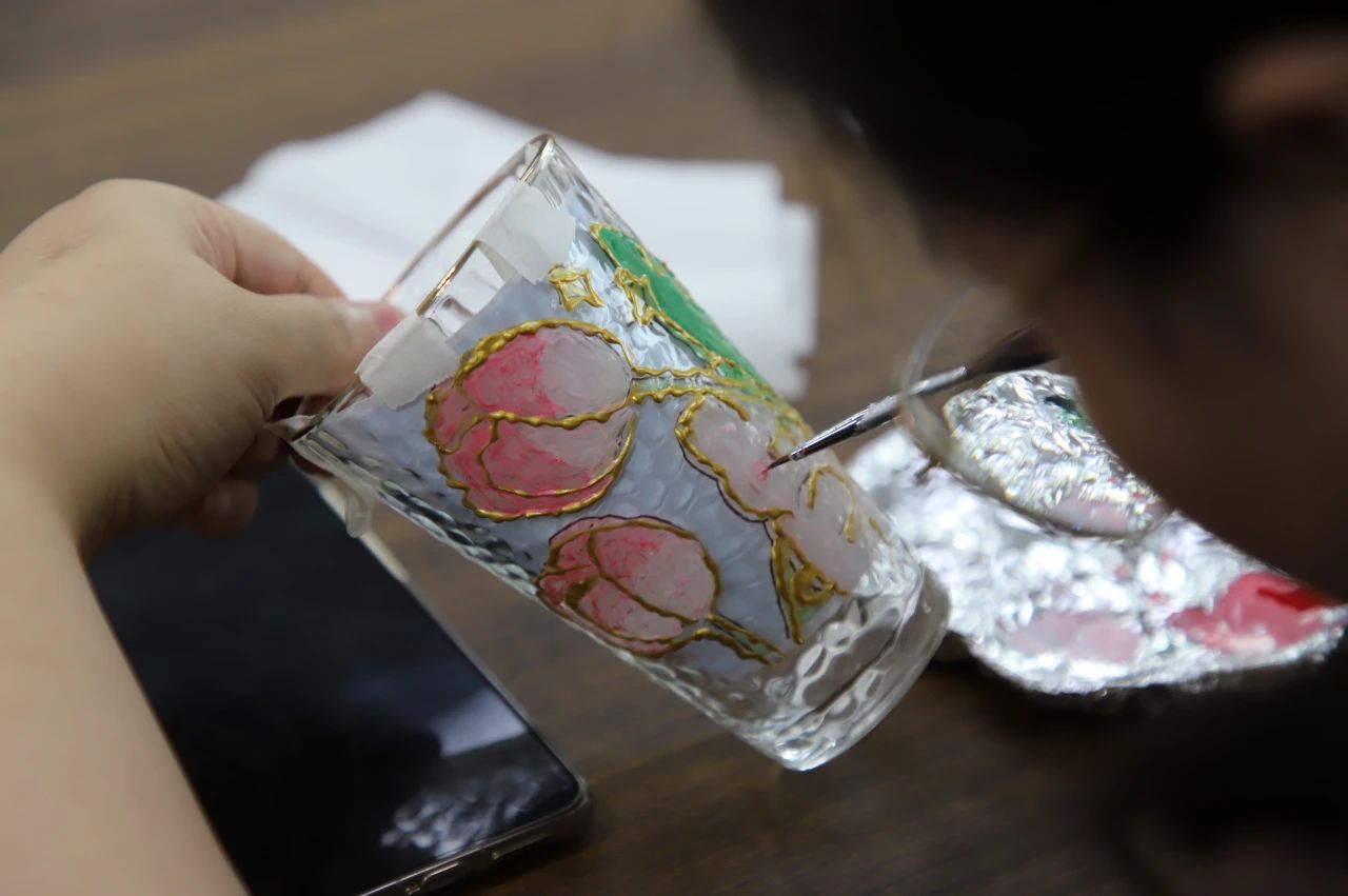 活動(dòng)中,公司工會(huì)特邀請(qǐng)了專業(yè)老師為參與活動(dòng)的女職工講解了手繪玻璃杯的制作步驟、注意事項(xiàng)和彩繪技巧,女職工們以玻璃為畫(huà)布,以興趣為靈感,在老師的指導(dǎo)下,盡情發(fā)揮想象,各自選定彩繪主題,提筆用玻璃專用顏料勾勒出一幅幅花卉、動(dòng)物圖案,現(xiàn)場(chǎng)每個(gè)人都投入在藝術(shù)創(chuàng)作中,小小的玻璃杯成了大家發(fā)揮創(chuàng)意和想象力的“舞臺(tái)”。大家互相討論,相互幫忙,你扶著我畫(huà),我扶著你畫(huà),現(xiàn)場(chǎng)其樂(lè)融融。