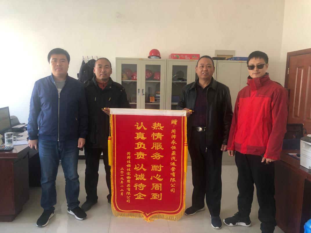 12月12日,菏澤佳諾佳寵物用品有限公司工作人員將一面印有“熱情服務(wù) 耐心周到 認(rèn)真負(fù)責(zé) 以誠(chéng)待企”的錦旗送到永恒蒸汽運(yùn)營(yíng)公司,感謝對(duì)他們的支持和幫助。