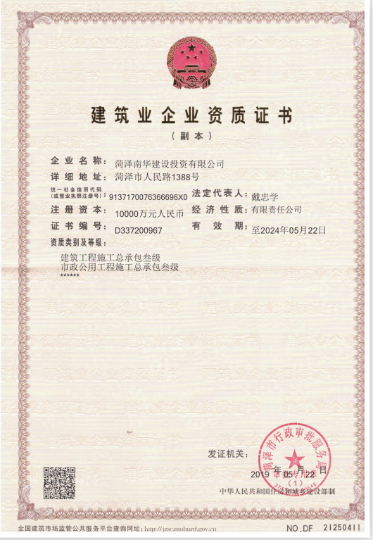 喜報(bào)--菏澤南華建設(shè)投資公司正式取得建筑工程、市政工程三級(jí)資質(zhì)